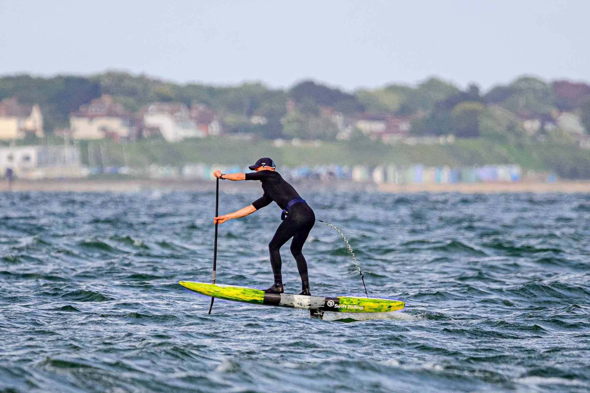 - Lepe on a light SW’ly (say 10-15 knots) and strong upwind tide gives enough bump energy to ride a big foil with a paddle. Ride downwind past the spit cardinal mark and cruise back upwind gently paddling on the current.